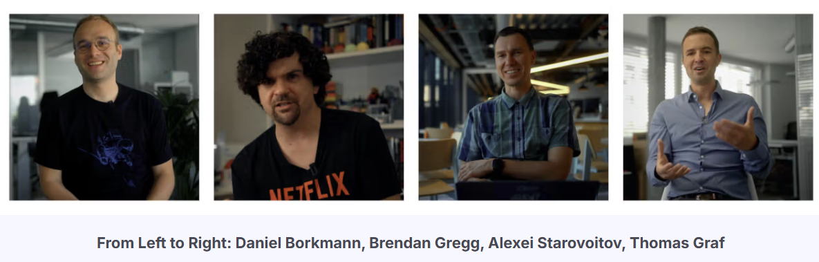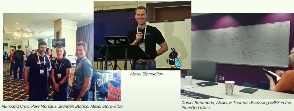 - eBPF의 시작은 2014년 Plumgrid에서 ebpf를 처음 리눅스 커널에 도입함. 왼쪽 사진은 차례로 Pere Monclus, Brenden Blanco, Alexei Starovoitov, 그들이 처음으로 ebpf를 리눅스 커널에 도입했다. 오른쪽 사진은 Daniel Borkmann 포함해 토의하는 사진