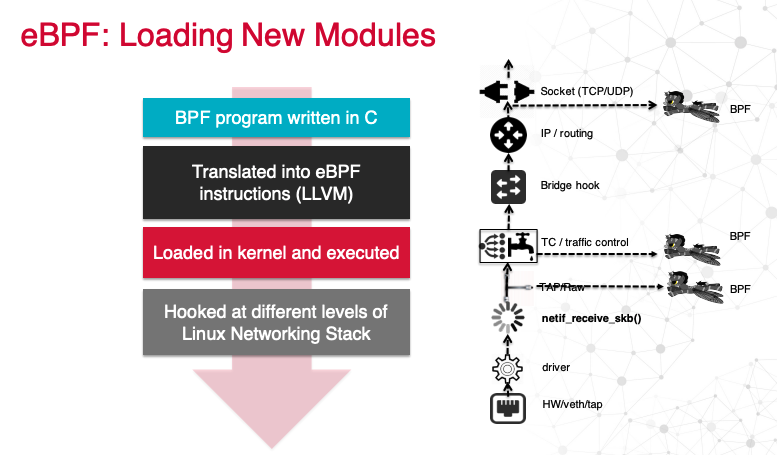 당시 자료의 eBPF에는 아래처럼 설명이 되어있다. C로 BPF를 개발 > LLVM(Low Level VM)을 통해 eBPF 명령어로 변환 > 커널 로드 및 실행 > 리눅스 네트워크 스택의 다양한 레벨에 연결됨(Hooked)
