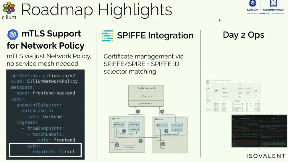 - 실제 로드맵. 네트워크 정책에 대한 mTLS 지원, SPIFEE 기반 mTLS의 원활한 배포. yaml 두줄로 다 처리되도록 통합. day 2 운영 개선