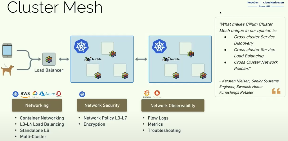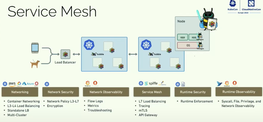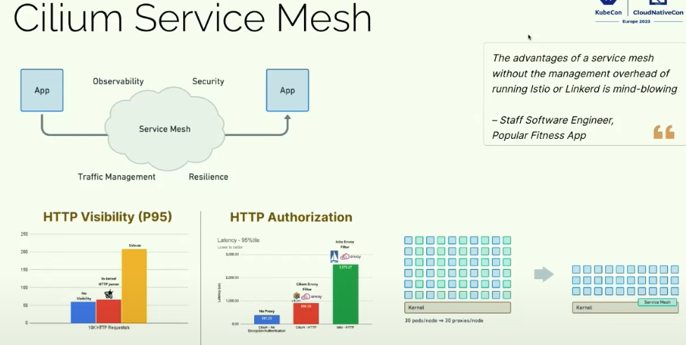 - 작년(2022) 서비스 메시를 소개함. 커뮤니티에서 service mesh 요구가 많았는데, 이미 시장에 service mesh 가 많은데 왜 또 하나가 필요하냐는 의문이었고, 사람들의 피드백은 사이드카 프록시를 없애달라는 것이었다. 그래서 투명한 인프라의 일부로 서비스 메시를 출시했다.