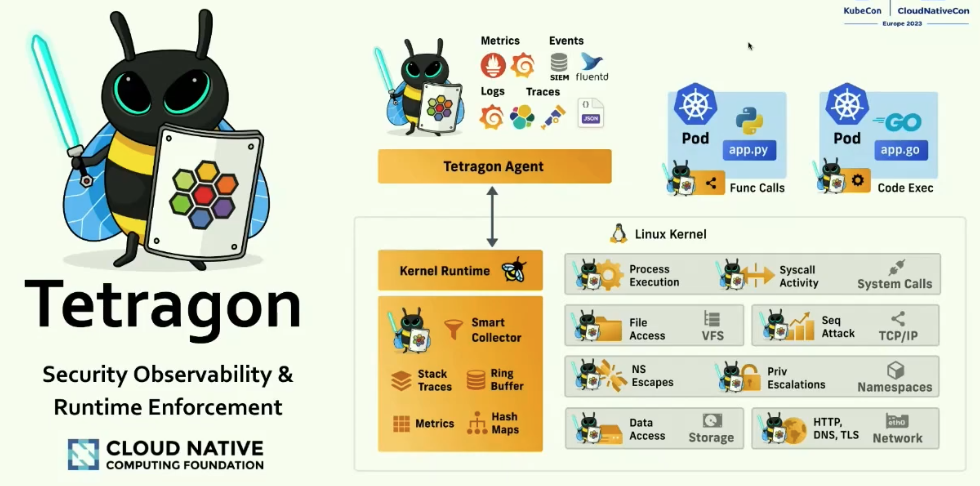 - Tetragon 을 소개함. 모든 노드에서 eBPF기반으로 실행되어, 네트워크 뿐만이 아니라 런타임에 대해서도 보안적으로 관찰 가능성을 제공하고 런타임 정책을 적용할 수 있음.