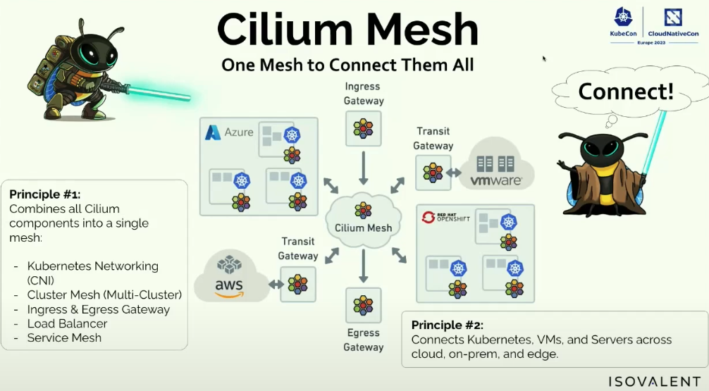 - cilium mesh 를 통해서 transit gateway 처럼 동작해서 모든 인프라 네트워크를 통합 할 수 있도록 계획. CNI를 cilium을 사용하는게 아니라 cni 위에 chaining mode로 cilium을 실행해서 기존 cni를 유지한 채로 통합.