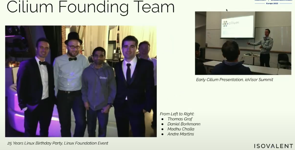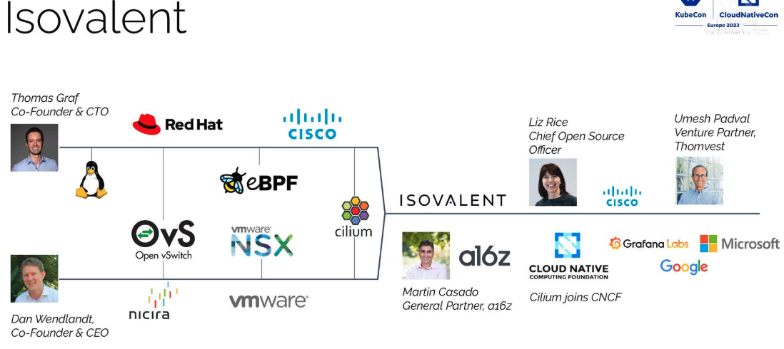 - Isovalent 가 시작된 역사. 타임라인. 공동창업자는 Thomas Graf 와 Dan Wendlandt이다. Thomas는 레드햇에서 Dan은 Nicira라는 회사에서 Open vSwitch 를 작업하다가 만났다. eBPF가 탄생하고 시스코에 들어가서 Cilium 작업을 시작했고, Cilium을 만들고 나서 Andreessen Horowitz(16z, 벤처 캐피탈)의 첫 라운드 투자와 함께 창업.